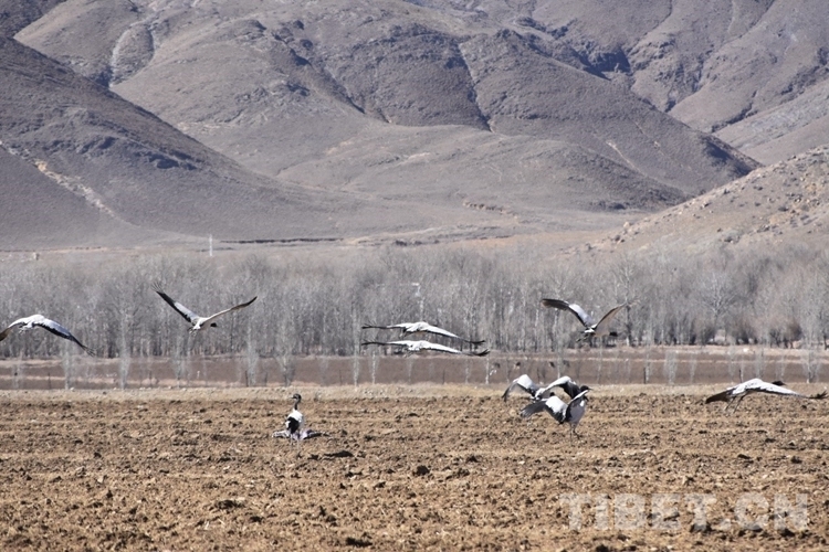 圖為1月18日,西藏林周強(qiáng)嘎鄉(xiāng)附近一群黑頸鶴飛過(guò) 攝影:次旦拉姆