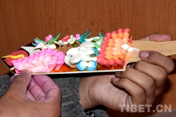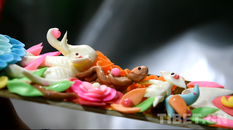 酥油花是藏民族雕塑藝術的一種特殊形式,它是以人物、花卉、樹木、飛禽、走獸等為主題的一種手工油塑藝術,具有悠久的歷史。藏歷新年期間,西藏群眾會在切瑪盒的左右兩邊分別裝滿糌粑和炒青稞,然后在上面插上象征五谷豐登的“羅薩美朵”(彩色青稞穗)和寓意吉祥的酥油花。(中國西藏網(wǎng) 記者/次旦拉姆)