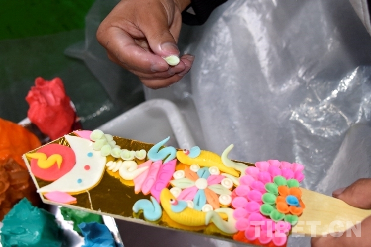 旦增說,酥油花只在藏歷新年前銷售,售價在60元到300元不等。期間,他們一家5人每天8時30分左右開始捏制,一直持續(xù)到深夜23時許,按圖案復雜程度,每人一天可以捏制近7到10余對酥油花。