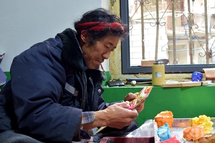 “我們一般在藏歷新年前20天左右到達拉薩。買酥油,和礦物染色原料調至成泥狀后便開始捏制?!钡┰稣f,普松鄉(xiāng)有制作酥油花的傳統(tǒng),每年藏歷新年臨近,他們便結伴來到拉薩制作酥油花銷售。
