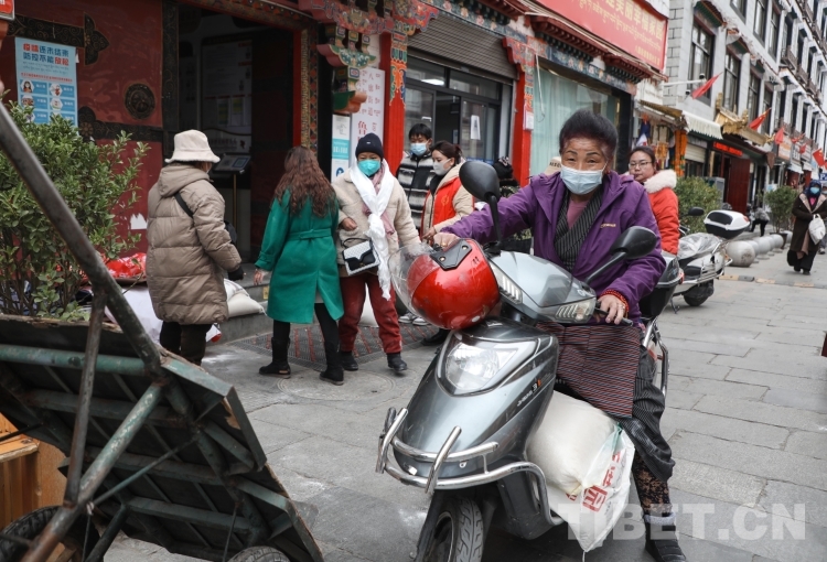 圖為社區(qū)工作人員阿旺曲宗幫居民搬運(yùn)糧油 攝影:呂靜
