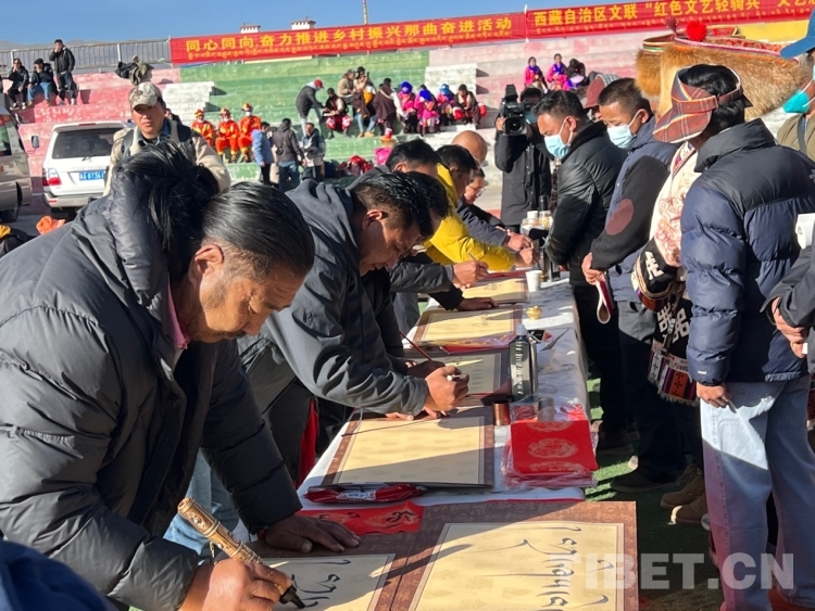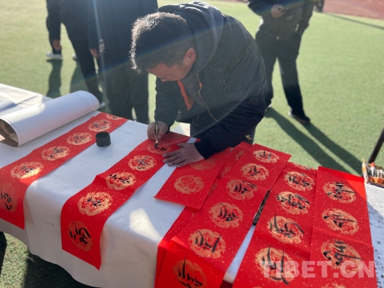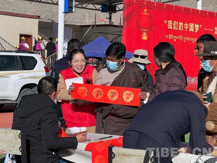 中國(guó)西藏網(wǎng)訊 2月16日,西藏自治區(qū)文聯(lián)主辦的“我們的中國(guó)夢(mèng)”——文化進(jìn)萬(wàn)家活動(dòng)在極高海拔生態(tài)搬遷安置點(diǎn)開(kāi)展。在送“書(shū)法”現(xiàn)場(chǎng),由西藏書(shū)法協(xié)會(huì)和山南市11位書(shū)法家為當(dāng)?shù)厝罕娝腿?00多張?jiān)⒁饷篮玫男履曜8:腿罕娖谕男履曜T傅取;顒?dòng)現(xiàn)場(chǎng)群眾絡(luò)繹不絕,大家心滿意足地拿著書(shū)法家為自己贈(zèng)送的精美“禮品”。一旁書(shū)法家們忙碌地為群眾書(shū)寫(xiě)祝詞,另一旁群眾們晾曬著他們得到的書(shū)法作品,一時(shí)間現(xiàn)場(chǎng)成了“書(shū)法展”,時(shí)不時(shí)地有人前來(lái)參觀欣賞。(中國(guó)西藏網(wǎng) 記者/德吉卓瑪)