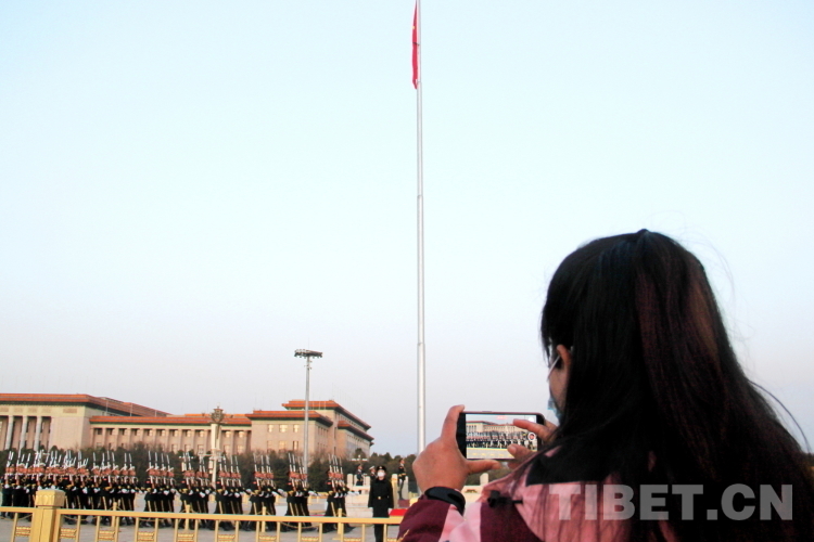清晨6時許,軍樂團在天安門廣場就位?!罢阶?!”隨著一聲響亮的口令,國旗護衛(wèi)隊邁著鏗鏘的正步,拱衛(wèi)國旗走過天安門城樓、金水橋?!跋驀炀炊Y!”6時9分,隨著響亮的口令,軍樂團奏響了國歌《義勇軍進行曲》,升旗手高高揚起國旗,鮮艷的五星紅旗迎著朝陽冉冉升起。“2023年西藏基層婦聯(lián)干部赴京學(xué)習(xí)參觀團”成員們紛紛用手機記錄下這難忘的時刻。