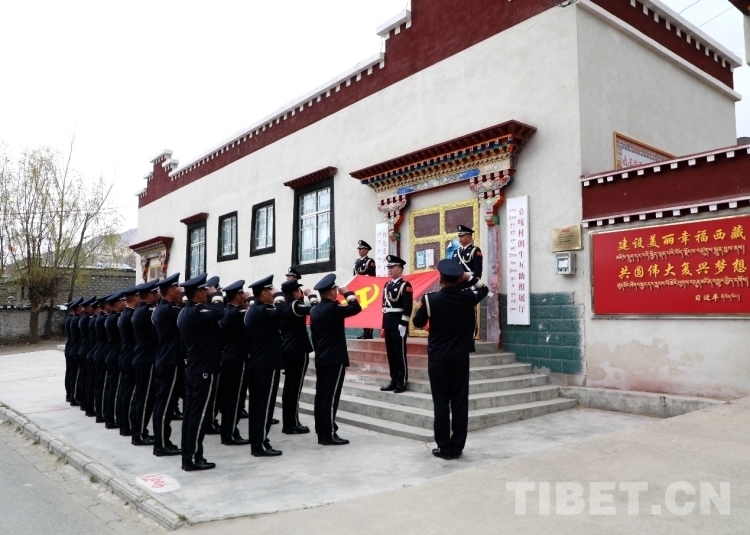 圖為山南邊境管理支隊機關黨員民警在乃東區(qū)結巴鄉(xiāng)朗生互助組展廳旁重溫入黨誓詞 攝影:鄭琦山