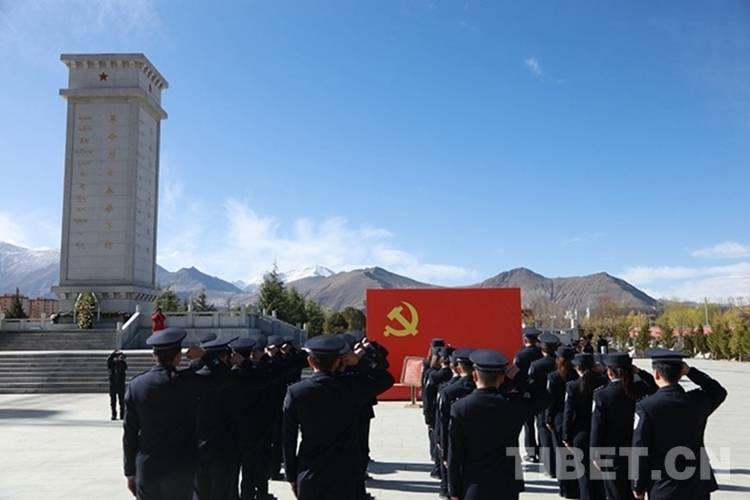 圖為西藏邊檢總站執(zhí)法調(diào)查支隊(duì)民警在烈士紀(jì)念碑前重溫入黨誓詞