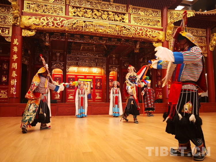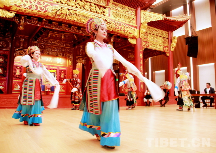 西藏藏劇團(tuán)副團(tuán)長米瑪普赤就藏戲的起源、藏戲的特點(diǎn)、藏戲的流派等進(jìn)行了詳細(xì)介紹。伴隨著雄渾響亮的鼓鈸聲,西藏自治區(qū)拉薩市城關(guān)區(qū)娘熱民間藝術(shù)團(tuán)的藝術(shù)家們表演了藏戲開場《溫巴頓》、藏戲唱腔《朗薩雯波》之貢桑德慶唱腔、拉薩囊瑪《吉白尼瑪》、嘎爾《郎卓》等經(jīng)典片段。精美的服飾、鏗鏘的唱腔、緊湊的故事情節(jié)……贏得了與會(huì)嘉賓的連連贊嘆與陣陣掌聲。