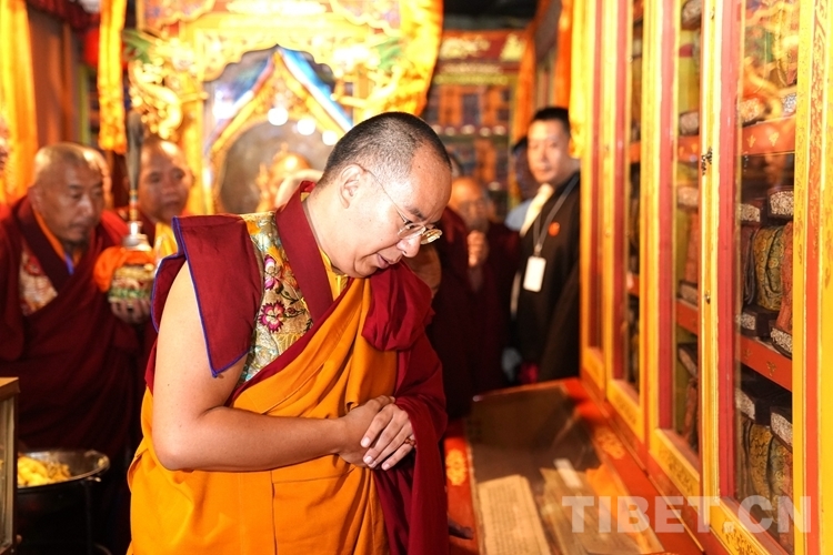 上午9時,在僧眾的期盼中,班禪抵達哲蚌寺。頓時,鑼鼓喧天,法螺、法號齊鳴。在手持香爐的高僧以及吹嗩吶的僧人引路,手持黃傘的高僧護送下,班禪緩步走進措欽大殿,逐一朝拜寺內(nèi)各殿堂,并向主供佛像敬獻哈達。期間,班禪還前往甘珠爾拉康參訪,這里藏有多部《甘珠爾》大藏經(jīng)。
