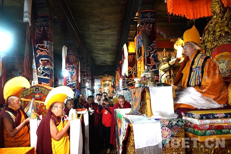 隨后,班禪登上措欽大殿法座為僧眾解經(jīng)釋教、摸頂賜福。