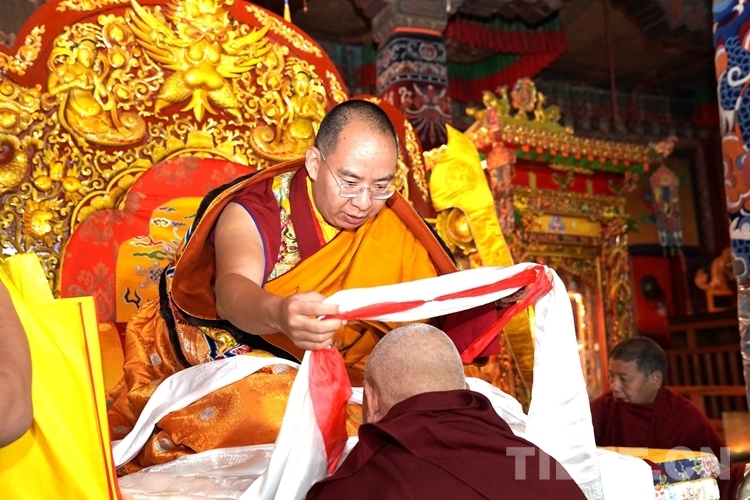 班禪傳授經(jīng)文時,僧眾無不虔誠俯首聆聽,他深厚的佛學造詣和卓越的宗教修為讓寺廟僧眾發(fā)自內(nèi)心地頂禮膜拜。講經(jīng)結(jié)束后,阿旺群增和僧眾手捧潔白的哈達排起長隊,井然有序地依次到法座前接受班禪摸頂賜福。每當年邁的僧人來到法座前,班禪都會親切地詢問年齡、身體狀況等,并祝愿他們健康長壽。