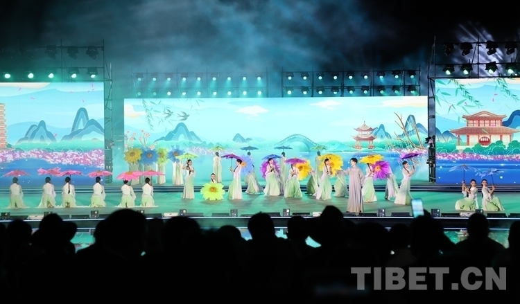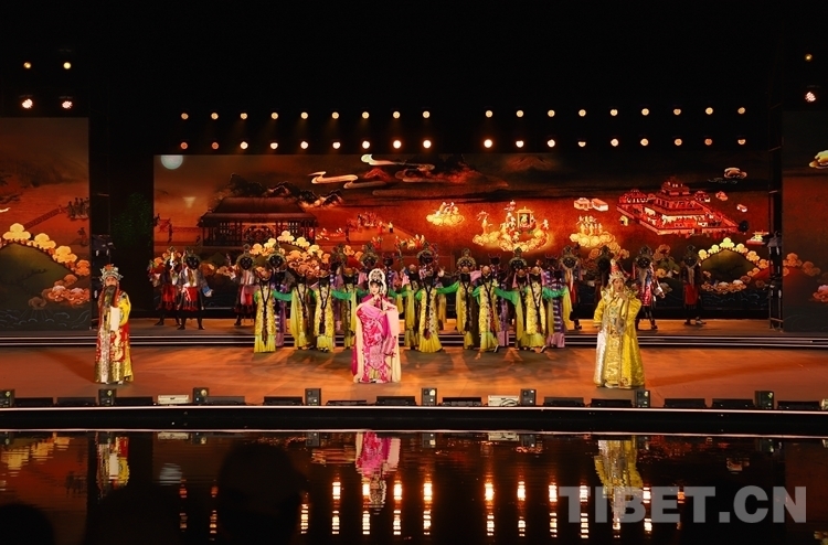 當(dāng)晚開幕式文藝演出共分為序《雪頓新韻》、上篇《相約雪頓》、下篇《心約拉薩》和尾聲《百年雪頓》四部分,整場文藝演出融合歌曲、舞蹈、藏戲、京劇、昆曲、街舞等元素,并以半實(shí)景的舞臺(tái)藝術(shù)形式上演《百年雪頓》等節(jié)目,線上線下呈現(xiàn)了一臺(tái)傳統(tǒng)與現(xiàn)代交相輝映、傳承與創(chuàng)新和諧相融、歷史與未來一脈相承的文藝盛宴。