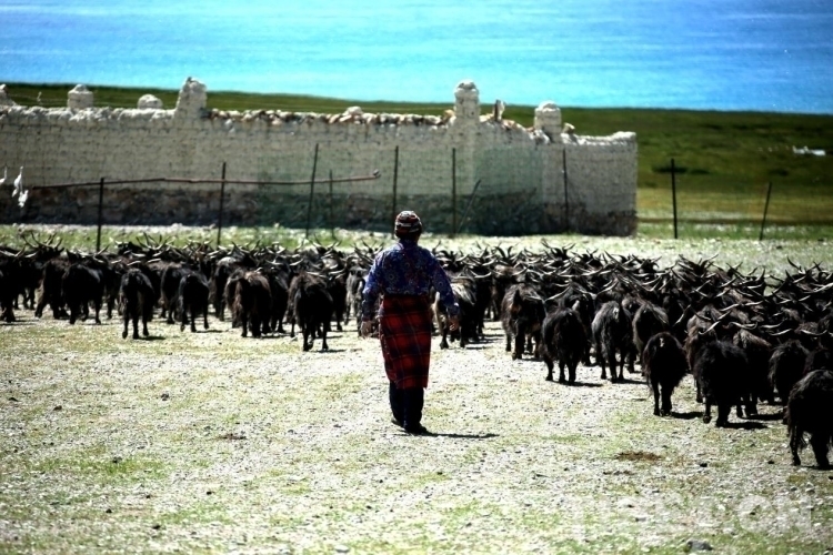 圖為牧民驅(qū)趕著紫絨山羊群前往扎日南木錯湖邊 攝影:王佳豪