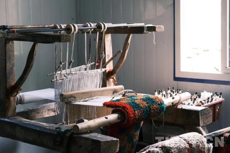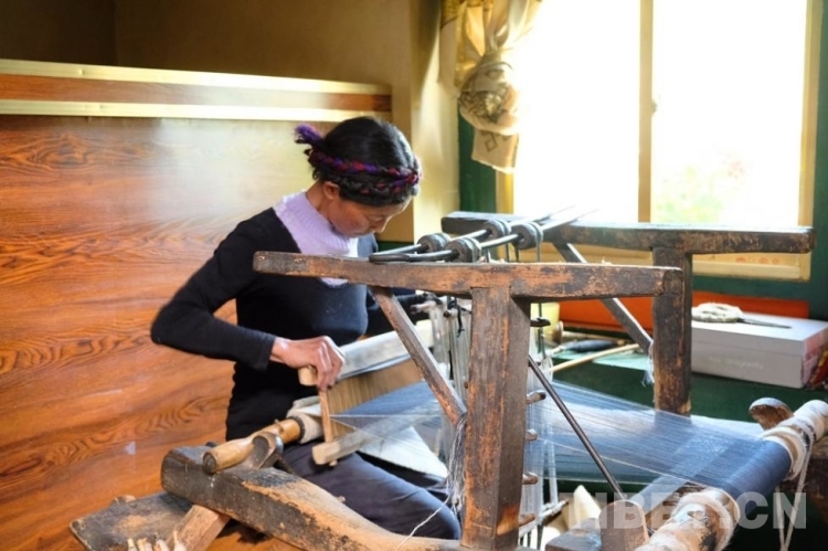 走進氆氌紡織間,隊員們看到木質(zhì)的紡織機在吱嘎作響,工人左右手快速地配合,雙腳在幾個踏板間有條不紊地轉(zhuǎn)換,雙眼緊隨著雙手快速地游移目光,嫻熟程度令人嘆為觀止。