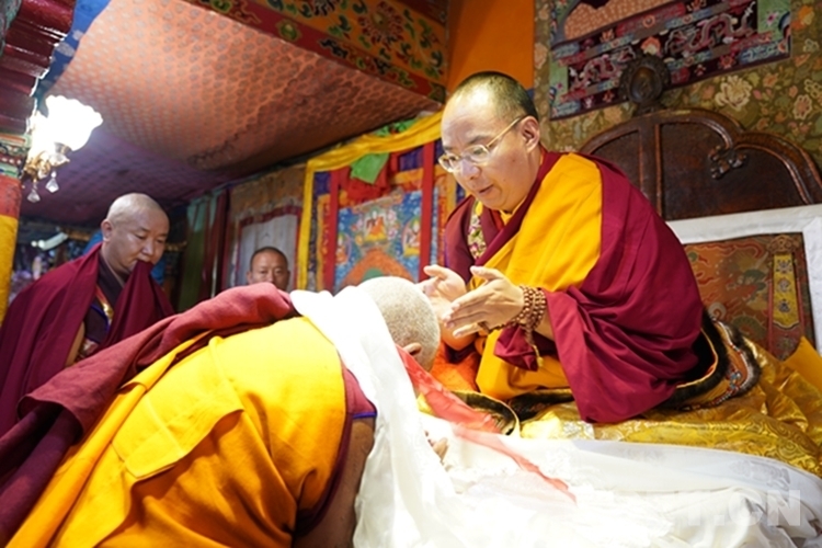 當(dāng)日下午,在扎什倫布寺拉讓日光殿,班禪登上法座,接受扎什倫布寺管委會(huì)僧人成員、高僧朝拜,為他們摸頂賜福,并帶領(lǐng)高僧誦經(jīng)祈福。