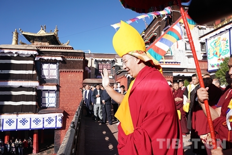 班禪一行順利抵達(dá)后,現(xiàn)場(chǎng)桑煙繚繞、法號(hào)長鳴,扎什倫布寺高僧代表向班禪敬獻(xiàn)哈達(dá),班禪向僧眾及在此等候的信眾們揮手致意。隨后,班禪在手持黃傘、香爐的高僧引領(lǐng)下徐徐而行,經(jīng)多加大院進(jìn)入措欽大殿。