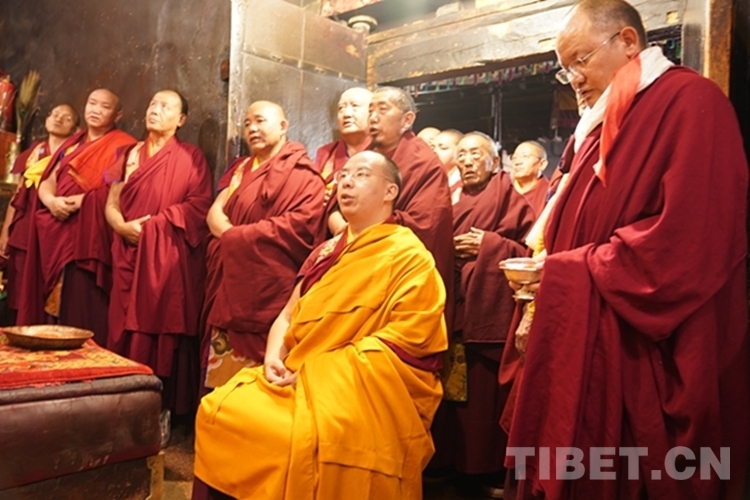 在措欽大殿,班禪虔誠叩拜供奉于此的佛祖釋迦牟尼佛像和藏傳佛教格魯派始祖宗喀巴佛像,與僧眾共同念誦經(jīng)文,之后回到寢宮拉讓殿。