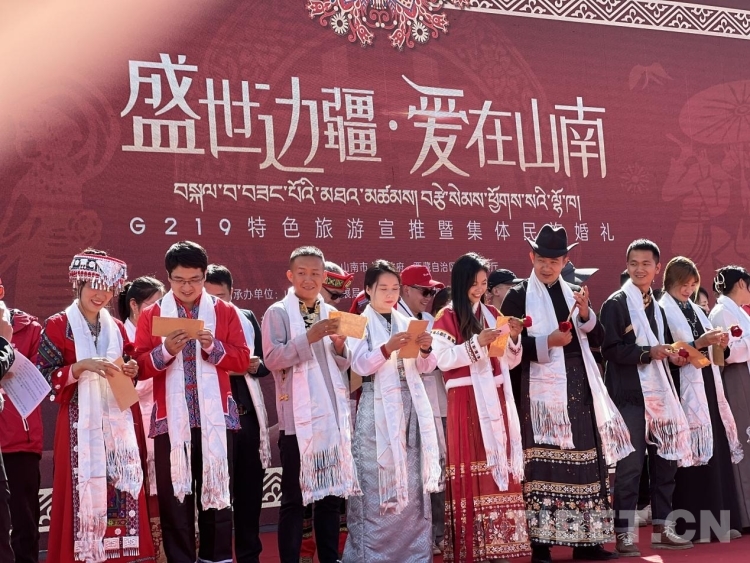 參加此次集體婚禮的新人中有來自北京、廣西、長沙、重慶等區(qū)外的游客,也有來自G219沿線縣(區(qū))的山南當(dāng)?shù)厍閭H,有漢族、藏族、彝族、苗族、回族等不同民族通婚的情侶、夫妻,他們年紀(jì)有別、身份不同、職業(yè)各異,卻都選擇來到山南奔赴這場浪漫之旅。在接下來的六天,他們將陸續(xù)前往山南市加查縣、隆子縣、措美縣、洛扎縣及浪卡子縣,在欣賞大美邊疆風(fēng)光、領(lǐng)略特色民族風(fēng)情的同時(shí),感受中華民族一家親的團(tuán)結(jié)精神。