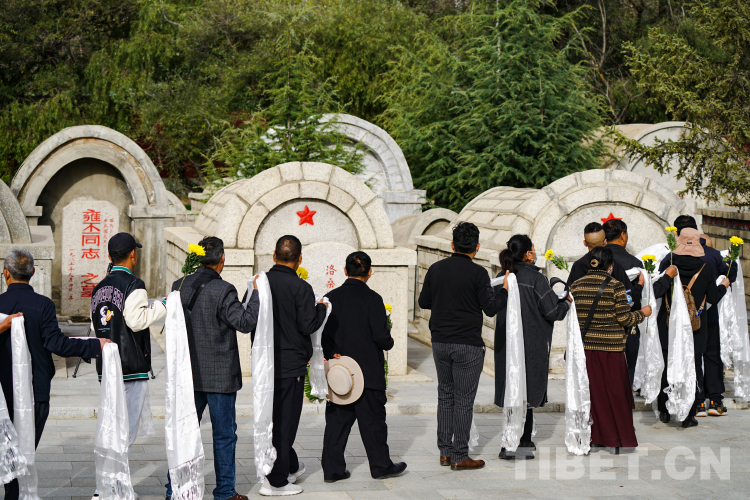 圖為參加活動的群眾代表向烈士敬獻鮮花和哈達。 攝影:趙振宇