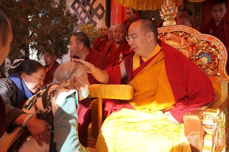 71歲的次仁曲珍老家在日喀則市拉孜縣,當(dāng)天在女兒的陪伴下拄著拐杖來到扎什倫布寺等候班禪摸頂賜福??吹嚼习屄呓喽U露出關(guān)切的神情,俯身向前,雙手接過哈達(dá)掛在老人的脖子上,輕輕為她摸頂,并祝福老人健康長壽。