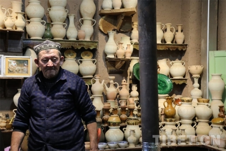深入高臺(tái)民居的內(nèi)部,就可以找尋到現(xiàn)存的土陶人家。步入這個(gè)安靜的小院,各式各樣的土陶制品立馬映入眼簾。土陶人家的店主吐爾遜·肉斯塔木是國(guó)家級(jí)非物質(zhì)文化“模制法土陶燒制技藝”的第七代傳承人,他從17歲開始獨(dú)立工作,如今68歲的他依舊挽起袖管,非常投入地沉浸在土陶工藝的創(chuàng)作世界里。