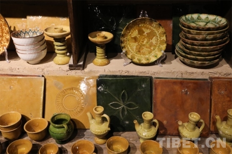 這里的土陶都緊湊而有序地被擺放在架子上,或者集中放在房間的空地上圍成一圈。一眼看去,架子上的土陶手工藝品都透露出泥土本身的顏色質(zhì)感,部分碗碟、杯具等制品通過各類顏色的浸染,呈現(xiàn)出青翠欲滴或金黃澤亮的顏色樣態(tài),在無(wú)聲中展現(xiàn)著古樸技藝的獨(dú)特魅力。