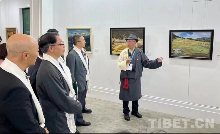 圖為現(xiàn)場(chǎng)嘉賓參觀西藏油畫作品現(xiàn)場(chǎng)