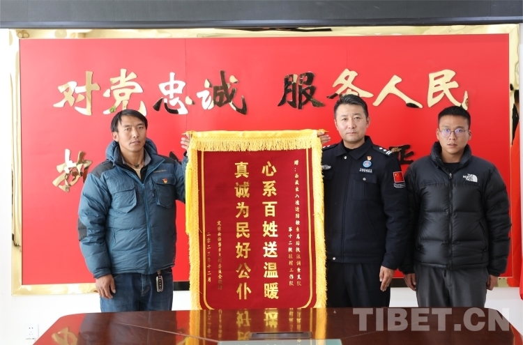 圖為曲當鄉(xiāng)差村支部書記向西藏邊檢總站執(zhí)法調查支隊駐村民警送錦旗 高昱攝