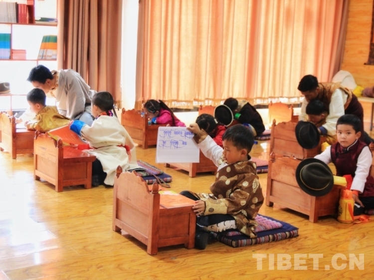 圖為在藏文書法課上認真寫字的小朋友們