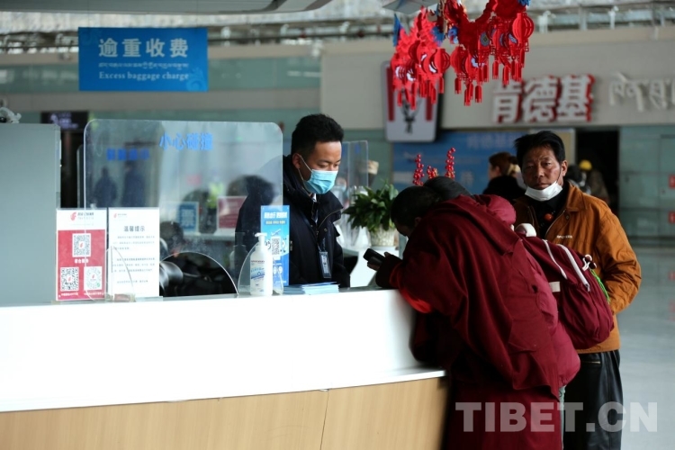 圖為春運(yùn)首日,拉薩貢嘎機(jī)場(chǎng)內(nèi)乘客辦理行李托運(yùn) 攝影:王佳豪