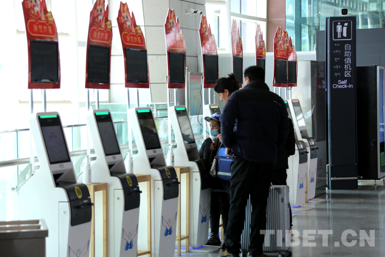 圖為春運(yùn)首日,拉薩貢嘎機(jī)場(chǎng)內(nèi)乘客在自助辦理值機(jī) 攝影:王佳豪