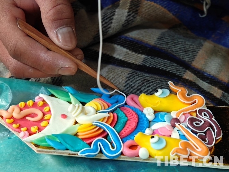 頓珠的二兒子丹增朗杰今年只有19歲,是一名高中生,但制作酥油花的手法已經(jīng)極為嫻熟。他盤腿而坐,面前擺放著調(diào)制好的各色酥油和一盆清水。只見他捏取一小塊酥油在冷水中浸泡一會(huì),然后熟練地用食指和拇指將酥油捏成不同形狀,粘貼于一塊盾形木板上,一對(duì)對(duì)色彩斑斕、寓意吉祥的酥油花作品便完成了。