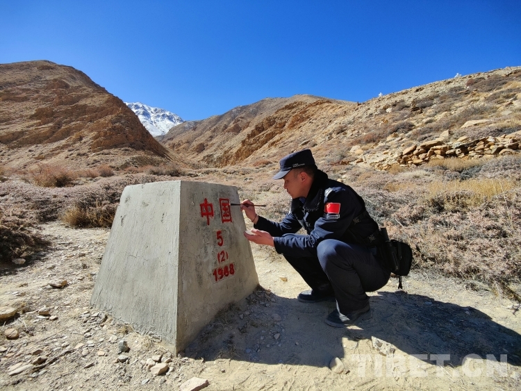 巡邏結(jié)束回到執(zhí)勤點(diǎn)后,邊巴次仁并沒(méi)有卸下執(zhí)勤裝備,而是拿著毛筆和紅油漆朝著執(zhí)勤點(diǎn)的河對(duì)岸走去,過(guò)河幾百米便是中尼5號(hào)界樁。“只有堅(jiān)守在邊境的我們才能體驗(yàn)到,除夕這天,為界碑描紅的自豪感?!彼贸雒P跟紅漆一筆一劃地描著界碑上的每一個(gè)字。“描紅界碑那一刻,眼前是界碑,身后是祖國(guó),我們守的是萬(wàn)家燈火。”邊巴次仁眼神堅(jiān)定地看著身前的界碑說(shuō)。