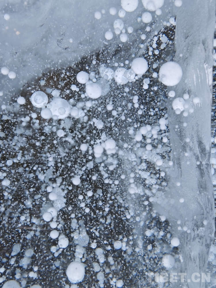 許多細小的白色氣泡懸浮在錯那湖厚厚的冰層之中。帕洛扎 攝