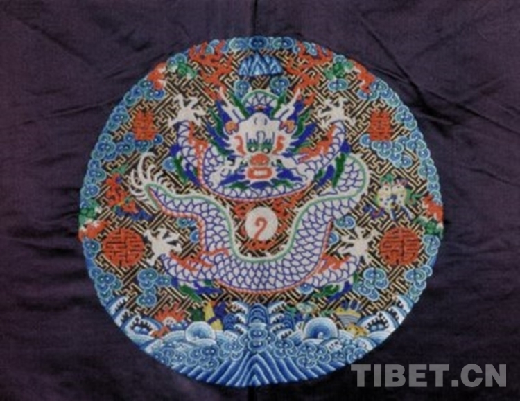 褂圓領(lǐng),對(duì)襟,平袖,裾后開。褂用二至四色暈法,在石青色緞地上以平針、套針、平金等針法及緝米珠工藝彩繡、穿綴萬(wàn)字地八團(tuán)彩云白龍紋、海水江崖及雜寶等紋樣。袍內(nèi)襯月白色祥云團(tuán)龍壽字織金緞里。袖口沿鑲石青萬(wàn)字織金緞邊。領(lǐng)口綴銅鎏金鏨花扣一,余綴石青色織金緞扣袢四。
