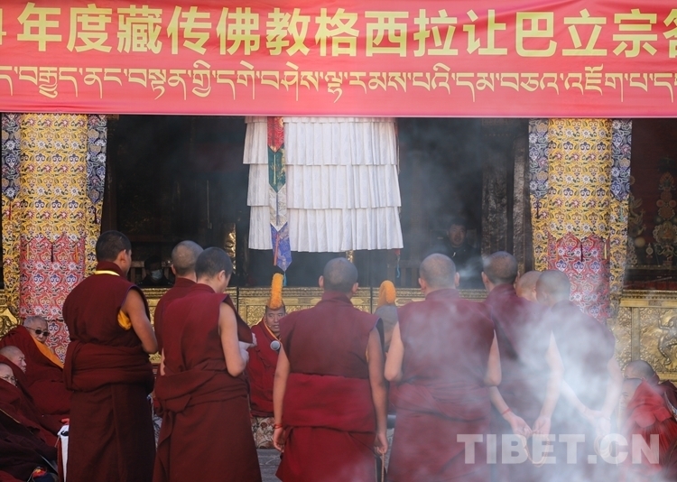 當(dāng)日上午9時(shí),立宗答辯儀式正式開始,儀式由藏傳佛教學(xué)經(jīng)僧人考取格西拉讓巴學(xué)位考評(píng)委員會(huì)主持。按照傳統(tǒng)慣例,先舉行無齋佛事活動(dòng),在考評(píng)委員會(huì)的監(jiān)考下,應(yīng)考格西拉讓巴學(xué)位的12名考僧輪流答辯陪考僧眾所提有關(guān)《釋量論》《般若學(xué)》《中觀學(xué)》《俱舍論》《戒學(xué)》五部經(jīng)典方面的內(nèi)容。立宗答辯儀式結(jié)束后,所有參加答辯儀式的僧人集體誦經(jīng)祈禱,同時(shí)供齋茶齋飯。齋后,由西藏自治區(qū)宗教局負(fù)責(zé)人代表西藏自治區(qū)政府向參加答辯活動(dòng)的僧人發(fā)放布施。