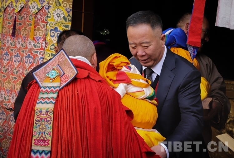 圖為西藏自治區(qū)政府副秘書長高寶軍向獲得學(xué)位的考僧贈(zèng)送五彩緞、干果、袈裟 攝影:賈華加