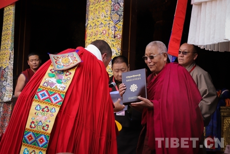 在頒證儀式上,西藏自治區(qū)政府副秘書長高寶軍,西藏自治區(qū)黨委統(tǒng)戰(zhàn)部常務(wù)副部長、自治區(qū)宗教事務(wù)局局長趙樹明受自治區(qū)領(lǐng)導(dǎo)委托,代表西藏自治區(qū)人民政府向獲得學(xué)位的考僧贈(zèng)送五彩緞、干果、袈裟和禮金。佛協(xié)西藏分會(huì)副會(huì)長、扎什倫布寺堪布噶欽?多吉堅(jiān)贊致賀詞,并代表班禪額爾德尼?確吉杰布會(huì)長向獲得學(xué)位的考僧獻(xiàn)哈達(dá),頒發(fā)學(xué)位證書。