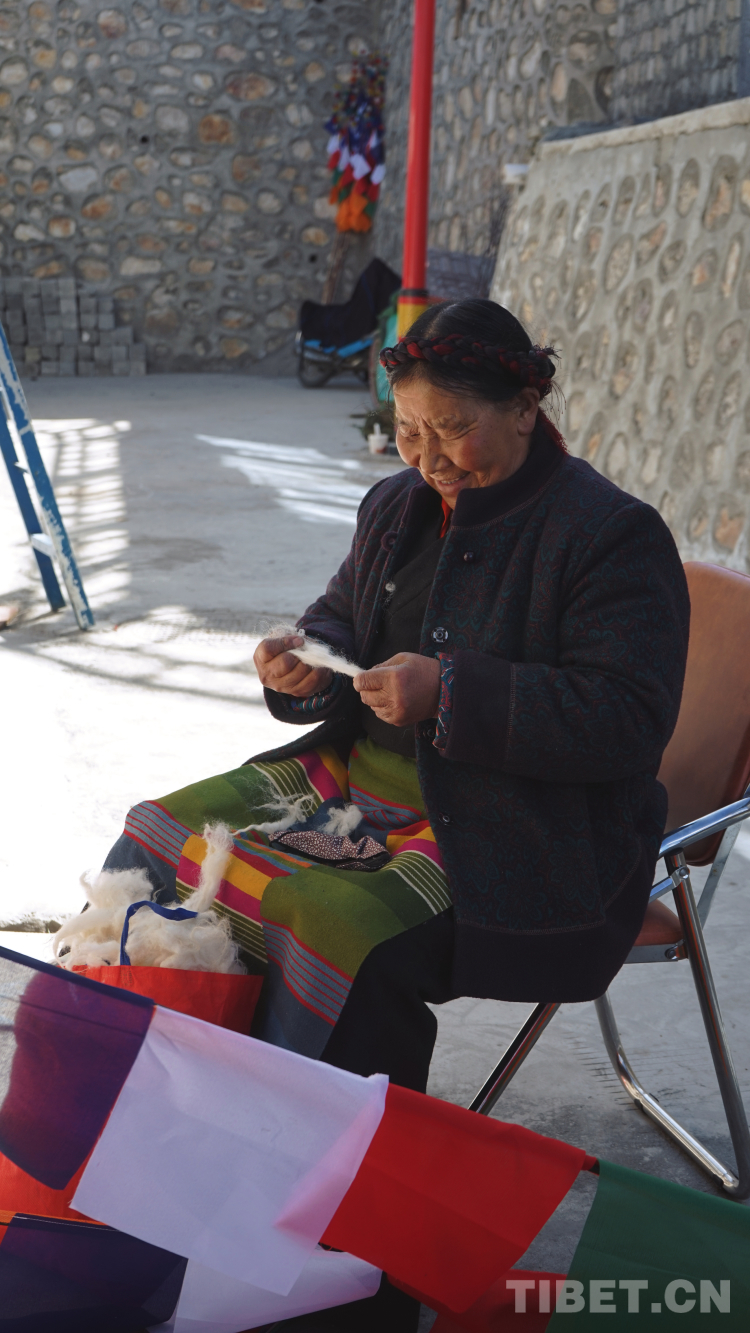 這是我最喜歡的莫啦。住在莫啦家的幾天里,除去采訪、收集素材和寫稿,最放松的時(shí)刻就是忙里偷閑和莫啦在廚房烤火、在巷子口曬太陽。莫啦會(huì)問我穿得這么少冷不冷,會(huì)給我講路過的小女孩有個(gè)雙胞胎姐姐,會(huì)讓我送熱水給我的同事喝,會(huì)拿盛滿卡塞和奶渣的點(diǎn)心盒塞給我吃,會(huì)在我想把手頭工作做完再吃飯時(shí)問同事我怎么不吃飯。當(dāng)然這些我大多是聽不懂的,有些是德瓊阿佳(莫啦的女兒,拉康社區(qū)婦女主任,同時(shí)也是客棧的老板)和達(dá)次哥(這次出差的司機(jī)師傅)翻譯給我的,有些是我倆通過比劃猜到的。