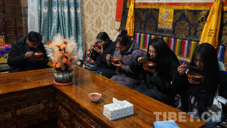下午時(shí)分,“古突”夜的準(zhǔn)備就開始了,先是將羊肉放入鍋中燉煮,再是將白蘿卜切片備好,隨后與奶奶、兩個(gè)女兒及丈夫,一家人圍坐在溫暖的廚房說說笑笑地捏“古突”里的面疙瘩,做面疙瘩時(shí),要準(zhǔn)備一些稍大的特殊面疙瘩,分別包進(jìn)寫有石子、辣椒、羊毛、木炭等字樣的紙條,代表“心腸硬”“刀子嘴”“心腸軟”“黑心腸”等含義,待到吃“古突”環(huán)節(jié),來一場(chǎng)藏式風(fēng)格的“開盲盒”,據(jù)說每個(gè)人吃到的字樣能在某種程度上代表新一年的運(yùn)勢(shì)或性格。
