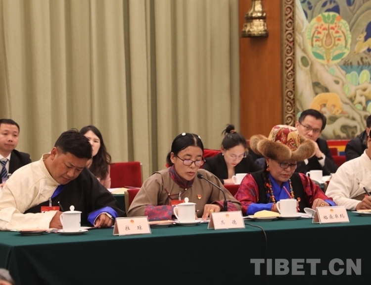 圖為其德在十四屆全國人大二次會(huì)議西藏代表團(tuán)開放團(tuán)組會(huì)議上發(fā)言 攝影:桑吉