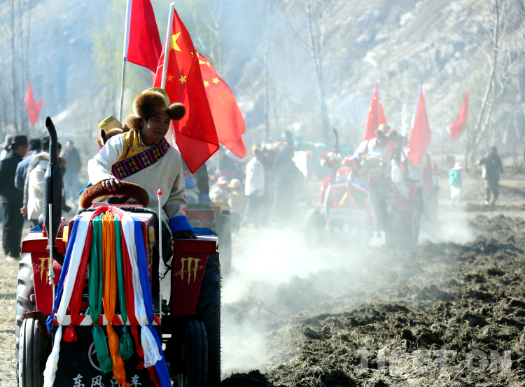 整個(gè)活動(dòng)充滿儀式感。村民們先是來(lái)到田地中央燃桑香、獻(xiàn)貢品,祈求風(fēng)調(diào)雨順、無(wú)災(zāi)無(wú)害、莊稼豐收。開(kāi)耕第一犁在吉祥喜慶的藏戲《扎西雪巴》表演中拉開(kāi)了序幕,一輛輛插著五星紅旗,用五彩哈達(dá)、花朵、吉祥圖案裝扮一新的拖拉機(jī)一字排開(kāi),涌向待墾的農(nóng)田進(jìn)行翻耕,播撒第一粒種子。