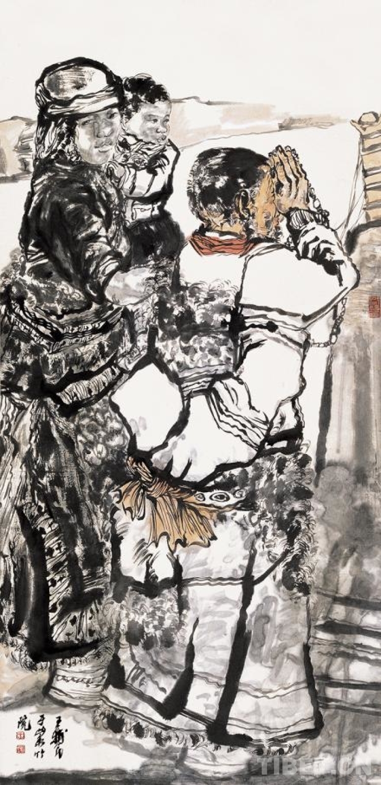“真正深入當(dāng)?shù)厝ンw驗(yàn)藏族群眾的生活,創(chuàng)作出來(lái)的作品才會(huì)真實(shí)感人?!蓖踺o民在談到藏族題材的創(chuàng)作感悟時(shí)說(shuō),“青藏高原最吸引人的地方是生活在這里的人們飽滿(mǎn)的精神狀態(tài)。我們要敬畏自然,尊重文化,保持充滿(mǎn)感情、充滿(mǎn)崇敬之情的創(chuàng)作情感和態(tài)度,用中國(guó)畫(huà)的水墨形式去表現(xiàn)藏族群眾的生活,去表現(xiàn)雪域的蒼茫與藏族群眾頑強(qiáng)不屈的性格,表現(xiàn)人與自然的關(guān)系?!?/p>