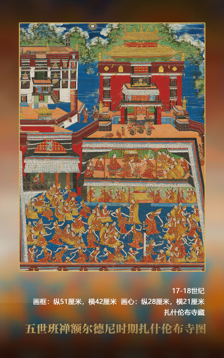 畫面以四世班禪靈塔殿為中心而不及其他,推測其年代應(yīng)為五世班禪時期。