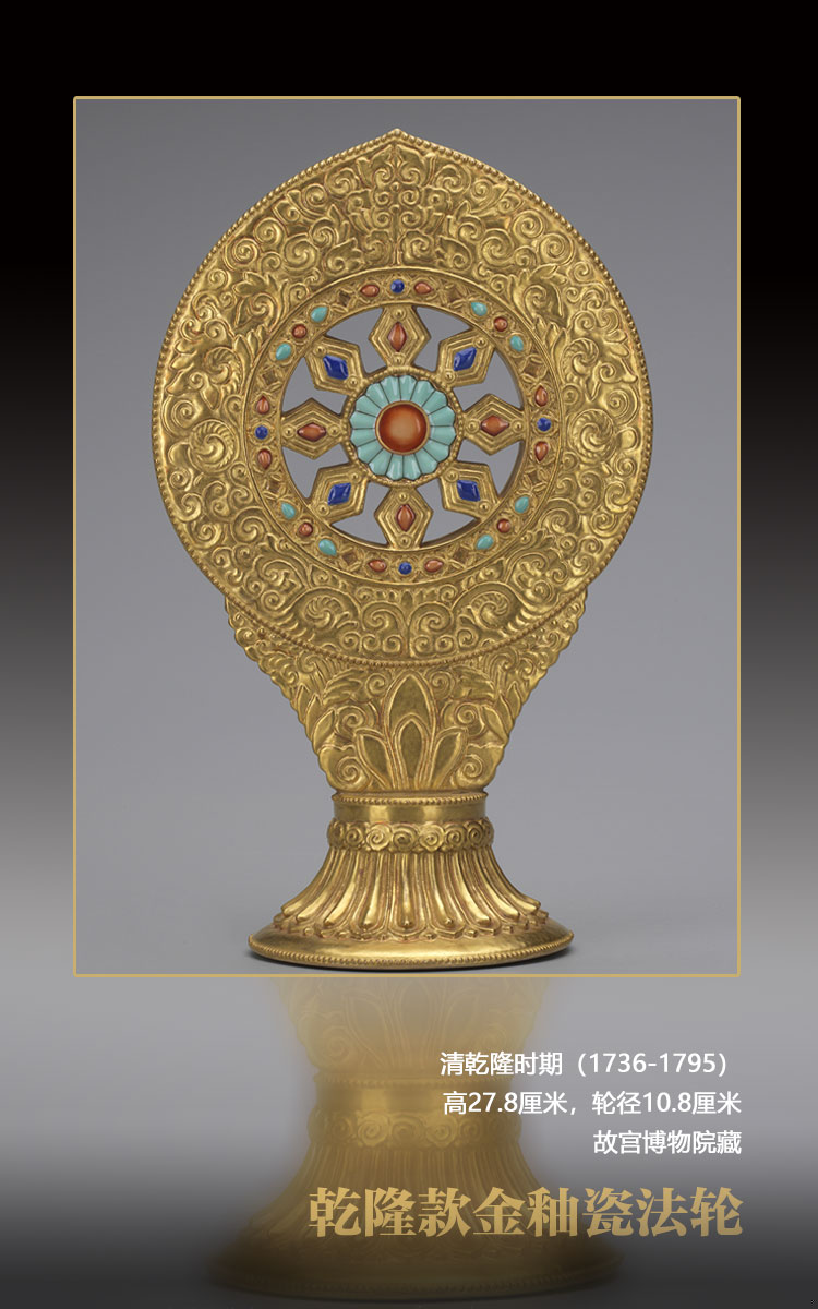 清代皇家崇奉藏傳佛教,乾隆登基后曾命內(nèi)務(wù)府造辦處下屬的景德鎮(zhèn)御窯廠燒制各式瓷質(zhì)佛像與法器備供奉之用。此款金釉瓷法輪仿自當(dāng)時銅鎏金法輪,為乾隆朝所首創(chuàng),至嘉慶朝仍有制作,只是底款不同,型制并無區(qū)別。這種瓷質(zhì)法輪不僅以金彩仿出銅鍍金效果,還以色彩鮮艷的釉色仿出綠松石、青金石、珊瑚等各種寶石,不得不贊嘆當(dāng)時工藝的創(chuàng)新與突破。