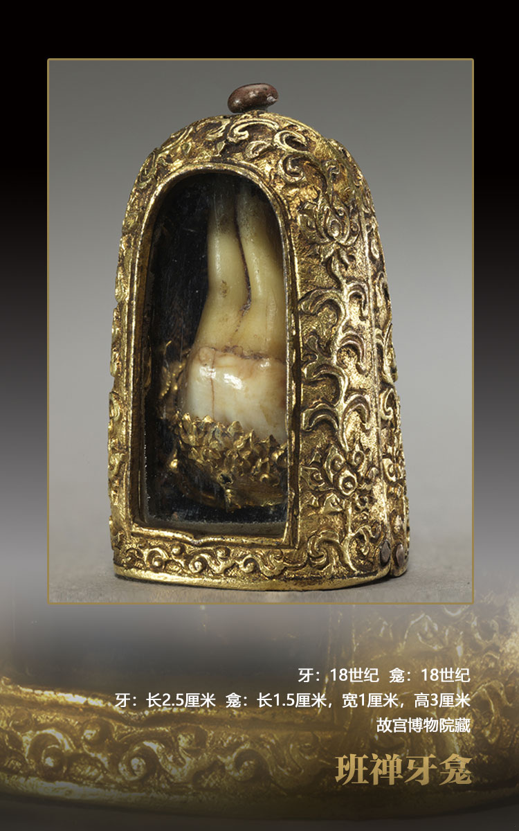 佛教世界的傳統(tǒng)觀念認(rèn)為,牙也是舍利的一種。在藏傳佛教中,上師火化后留下的牙、骨等均視為神圣之舍利,或供于佛堂,或葬于佛塔內(nèi),永久禮拜。這顆班禪牙也應(yīng)視為班禪最神圣的法物——舍利來看待。