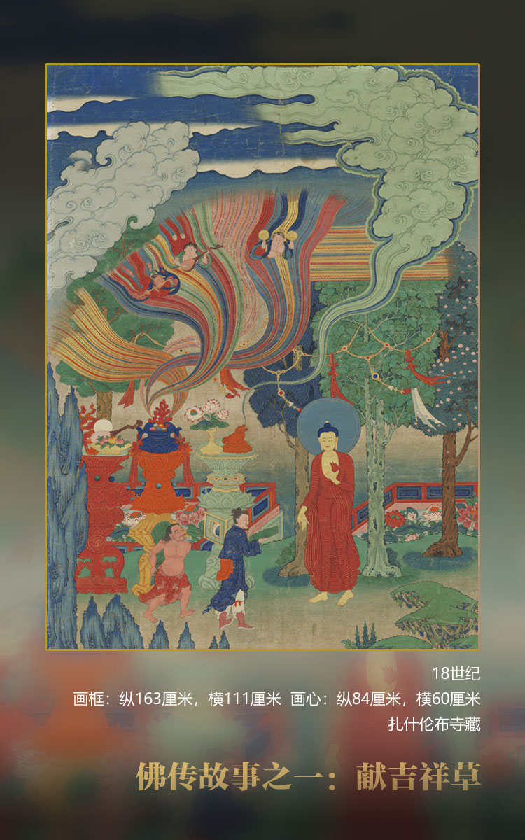 唐卡背后有墨書小字四句偈頌:sNgon gyis rgyal ba'i mdzad pa bzhin/ byang chub rdzogs sangs rgyas pa'i phyir/ rtsa (rtswa) 'tshong bkra shis rtsa (rtswa) bslang bas/ dkyil dkrung dam bca' bstab der bdud ('dud)//意為:如往昔佛之功業(yè),為求圓滿菩提果。刈草人販吉祥草,頂禮供養(yǎng)金剛坐。