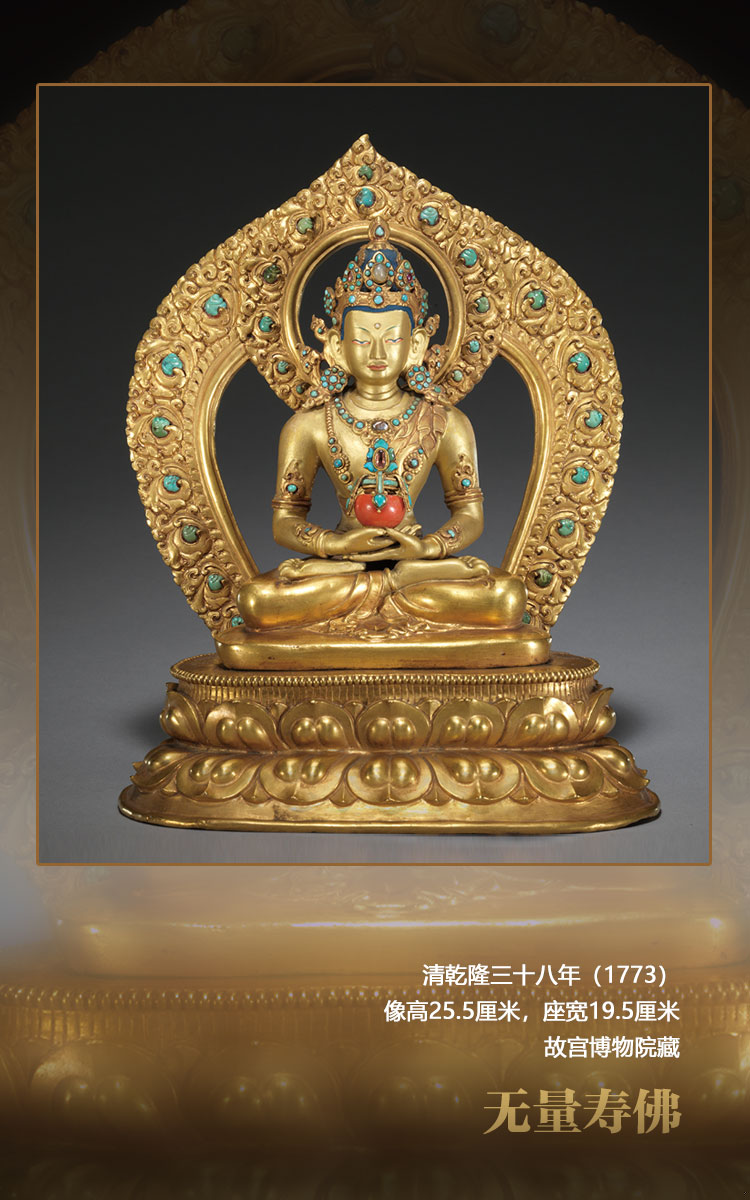 這尊造像與其他五十五尊同樣造型的無(wú)量壽佛,一同供奉在紫禁城養(yǎng)性殿西暖閣佛堂的一座八面七層的紫檀木佛塔中。根據(jù)《六世班禪洛桑巴丹益希傳》、內(nèi)務(wù)府造辦處《活計(jì)檔》及軍機(jī)處滿文檔案的記載,乾隆帝在乾隆三十五年(1770)寧壽宮區(qū)域營(yíng)建開(kāi)始前,即乾隆三十三年(1768)向六世班禪訂做了這五十六尊無(wú)量壽佛,佛像圖樣、鑲嵌寶石等材料均為宮廷提供。這些造像于乾隆三十八年完成并送回宮廷,此后一直供奉于養(yǎng)性殿佛堂至今。乾隆四十五年(1780)六世班禪進(jìn)京朝覲,還曾親自瞻仰過(guò)此塔此像。故這組無(wú)量壽佛,是乾隆時(shí)期宮廷審美與扎什倫布寺造像技術(shù)的高度融合,經(jīng)過(guò)乾隆帝本人親自設(shè)計(jì),又有明確的制作時(shí)間,是清代宮廷造像及扎什倫布寺造像研究的重要標(biāo)型器物。