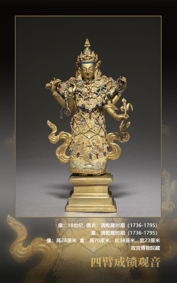 成鎖觀音,即不空羂索觀音。觀音一面四臂,分別持羂索、金剛杵、念珠、金剛鉤,在現(xiàn)在的圖像里很少找到持物相同的造像,可能是特別的傳承。觀音立姿站于方形臺(tái)座上。因其所著佛衣未曾打開(kāi),故造像身體裝飾情況不清。佛衣為清宮配做,繡工精細(xì),上綴串珠瓔珞,極具宮廷風(fēng)格。另有清宮配做紫檀木重檐亭式玻璃門佛龕,龕背面陰刻四體文題記,漢文為:“乾隆三十七年十二月十二日,欽命阿旺班珠爾胡土克圖認(rèn)看供奉大利益扎什璃瑪四背成鎖觀世音菩薩?!薄八谋场奔础八谋邸钡恼`書。