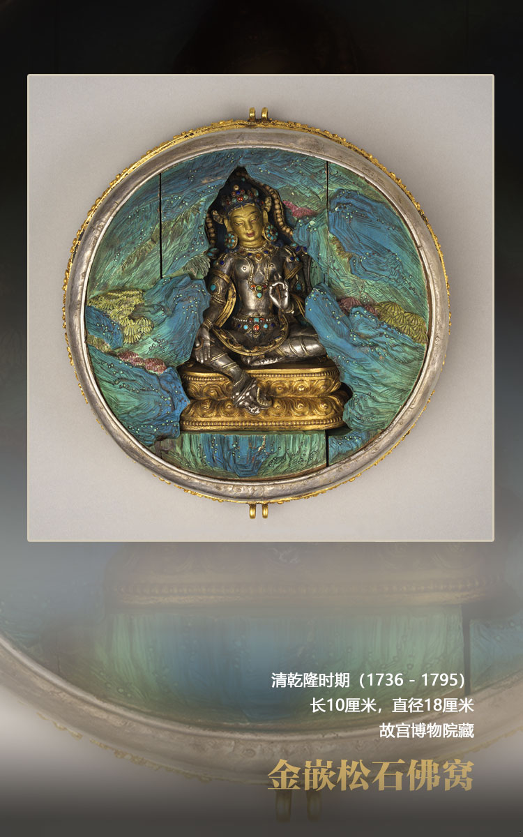 此佛窩九成金質(zhì),圓盒狀,金質(zhì)盒蓋上滿嵌梯形同心圓狀綠松石片,側(cè)面有三條松石鑲嵌的裝飾帶及蓮花紋圖案。盒蓋兩邊有可拆卸雙耳,可穿繩佩戴頸上,為護(hù)身佛盒。盒內(nèi)填染青綠木雕山洞,中間供有銀質(zhì)綠度母一尊。度母面部泥金,右手與愿印,左手說(shuō)法印,身上嵌綠松石、青金石、蜜蠟等,游戲坐于飾連珠紋和俯仰蓮瓣紋的金座上。附黃紙簽一張,上書漢、滿、蒙、藏四體文題記,漢文曰:“乾隆四十五年八月初七日,班禪額爾德尼恭?;噬掀哐f(wàn)壽,遞丹書,呈進(jìn)大利益綠衣救度佛母古佛?!?此處“大利益”有大功德之意,根據(jù)銘文可知,這個(gè)佛窩應(yīng)是乾隆帝七十大壽時(shí)六世班禪敬獻(xiàn)的祝壽禮物。(文圖資料來(lái)源:澳門藝術(shù)博物館 中國(guó)西藏網(wǎng) 記者/易文文 趙佳 呂靜 王東 姚浩然)