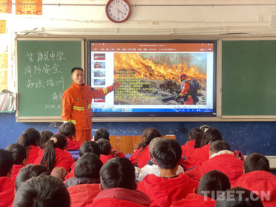 在芒康縣中學授課現場,芒康縣森林消防分隊負責人夏能向全校師生講解森林防火的重要意義、火災的起因、相關法律法規(guī)和常用防火知識等,教育引導同學們樹立森林防火意識,做到不帶火種進山,發(fā)現火情及時報警。