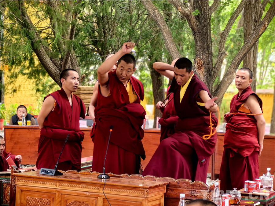 午后的陽光慵懶地灑在辯經(jīng)場,卻擋不住辯經(jīng)的智者們爭先恐后、高舉手臂提問,手臂向下?lián)]落,象征著智慧之劍砍向無知。熱烈的氣氛中,智者們拍手擊掌、獨(dú)立頓足、舞動佛珠、慷慨陳詞、大聲質(zhì)問,仿佛如此便得到了無窮的智慧?;顒蝇F(xiàn)場氣氛十分熱烈、精彩紛呈,交流內(nèi)容充實(shí)飽滿、將所學(xué)與實(shí)際相結(jié)合,充分展現(xiàn)了日常所學(xué)所思所得,閃光思維的碰撞迸發(fā)了智慧的火花,贏得了現(xiàn)場觀眾拍手叫絕,陣陣掌聲。